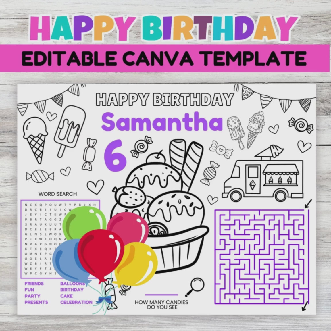 This is a wonderful Ice Cream birthday activity sheet for kids. The template is edited by you inside Canva after purchase. It's a great way to celebrate a birthday in the class you can add name and birthday age of child then print out for just child or all of the students to help celebrate a birthday. The sheet consist of word search, coloring , maze and an I spy game.